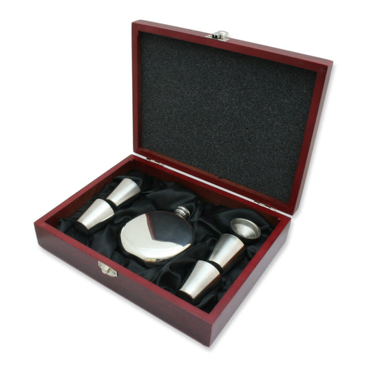 Round English Pewter Hip Flask 4.5oz With 4 x Stirrup Cups In Gift Box