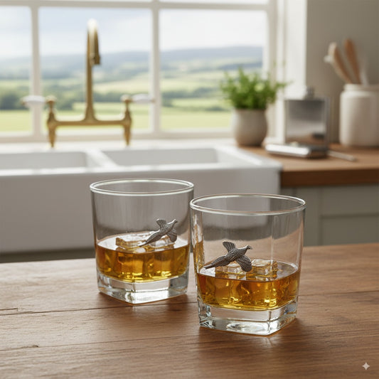Pair Of Whiskey Glass Tumblers With Pewter Pheasants