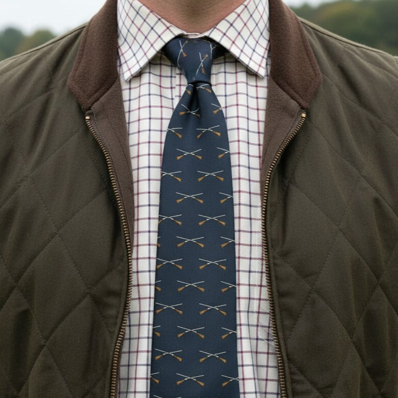 These great quality microfibre shotgun tie's feature a repeat pattern of a crossed shotguns. The tie's measures approximately 9 cm in width at the widest point of the tie blade and measures 140 cm in length. This tie adds a great look to your shooting attire on any shoot day.