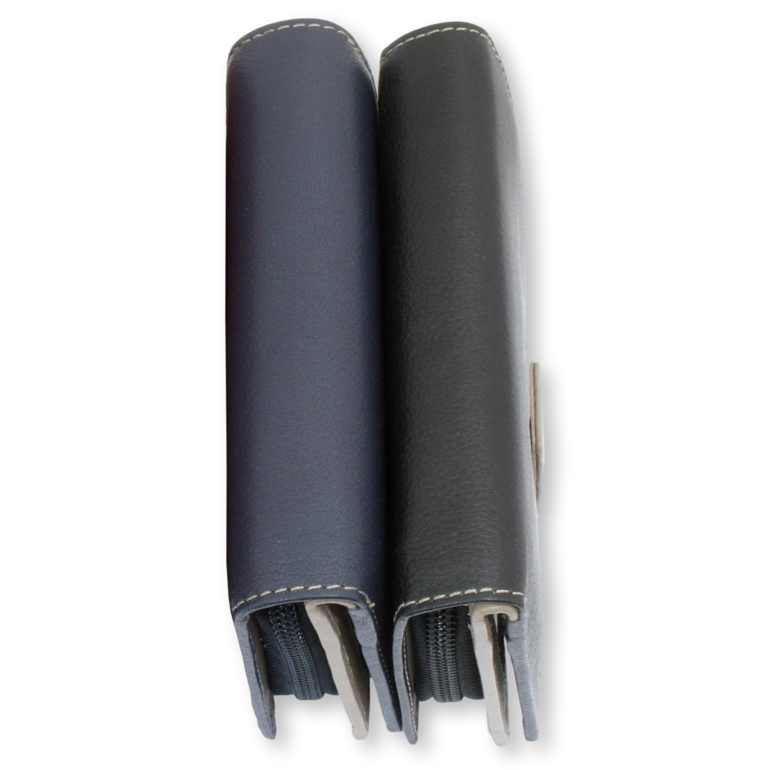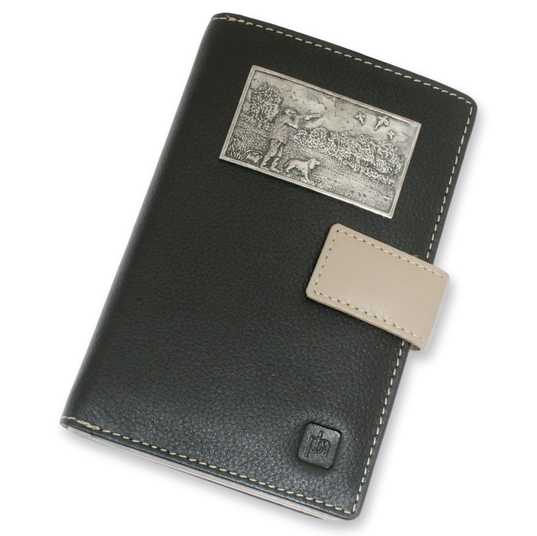 Full leather Ladies Purse in black and taupe two-tone leather designs, each adorned with a hand-cast English pewter shooting scene motif.