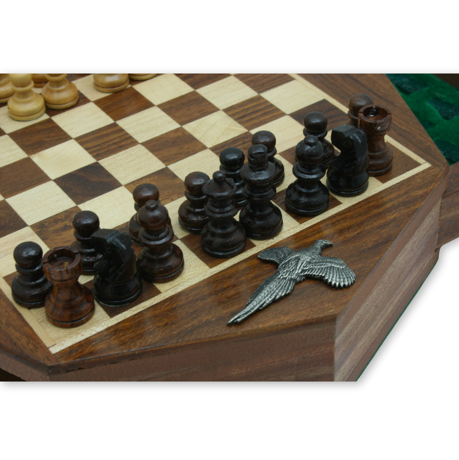 This Octagonal chess board showcases a classic chequered pattern, crafted from natural Indian rosewood for a stylish aesthetic. Precision-carved chess pieces are housed in a tray with well-cut grooves and a protective green velvet foam, ensuring organisation and preventing damage. Each magnetic piece adds stability during play, making it ideal for on-the-go gaming. The top-notch workmanship and craftsmanship, coupled with the pheasant hand-cast English pewter motif, make this chess set a perfect gift.