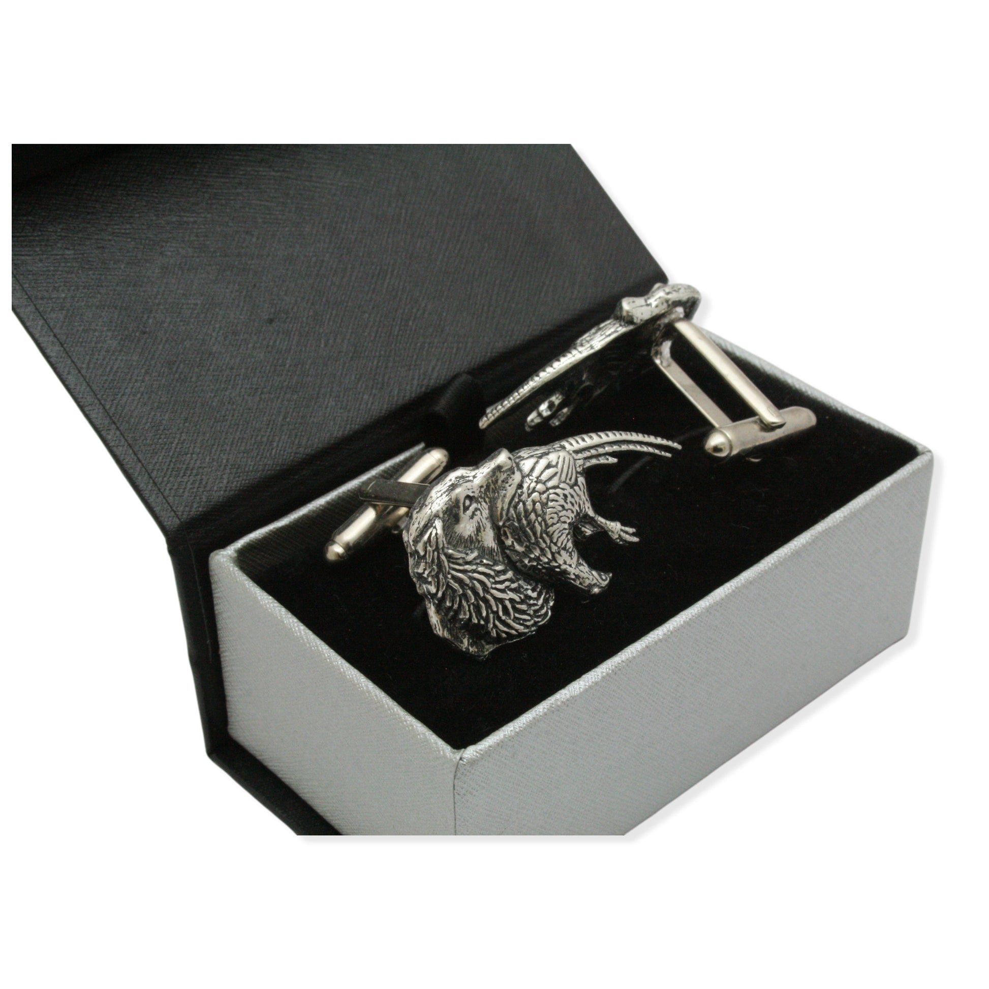 Spaniel and Pheasant Pewter Cufflinks Set In Box